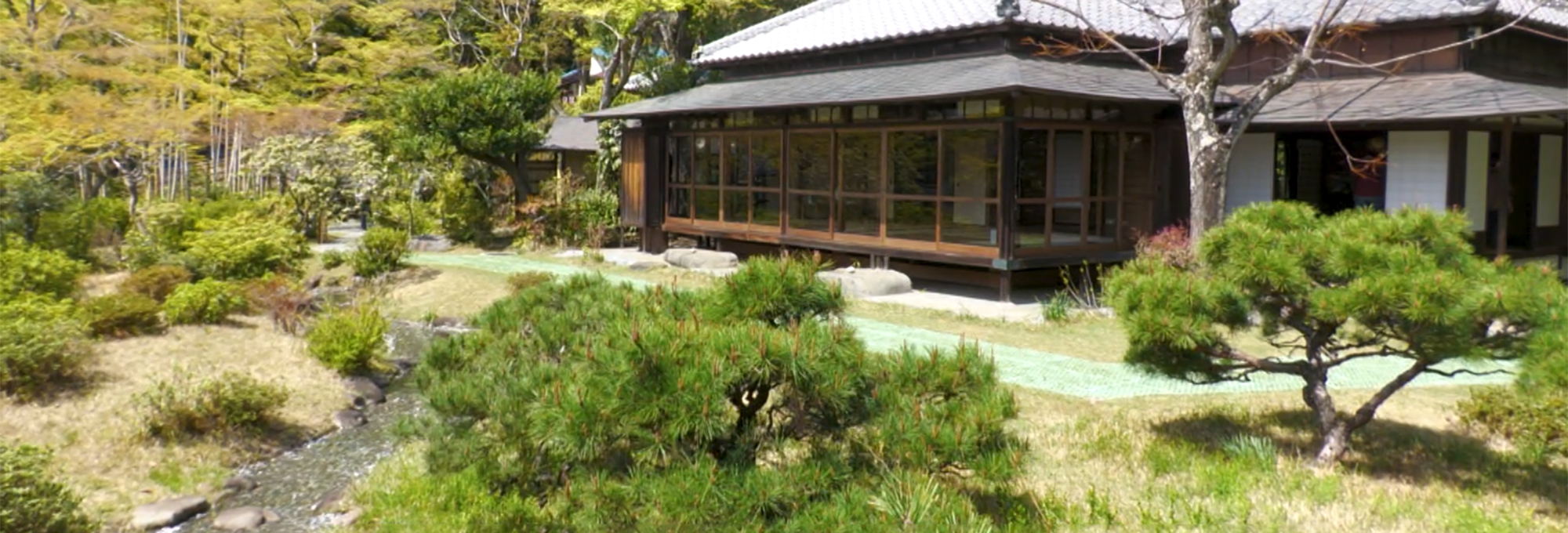 庭園内に水景を設けるための水源として山縣水道を開き、庭園の北東より南西にかけてせせらぎを造っており、